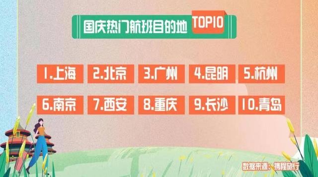 据携程旅行数据显示,国庆期间热门航班目的地前十名有:上海、北京、广州、昆明、杭州、南京、西安、重庆、长沙和青岛。
