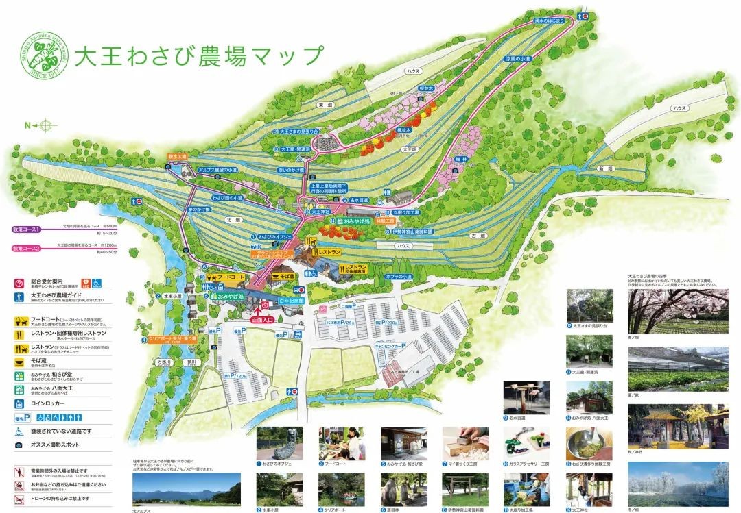 “春看樱花,夏看田,秋赏神社,冬看雪”,在15公顷(225 亩)的土地上,仅凭山葵产业,却创造出了自然景观、人文景观、商业景观等融为一体,每年游客访问量超过120多万人,不仅名声享誉国际,更带动当地附近旅游产业发展,这就是日本著名的大王山葵农场。
