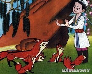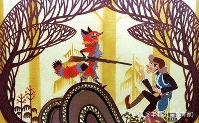 《狐狸打猎人》狐狸被人描述为一个可怕的恶狼,于是狐狸利用人们害怕的心理假扮成这个恶狼,最后夺下了吓破胆猎人的猎枪,最后猎人成为一个胆小的猎人!