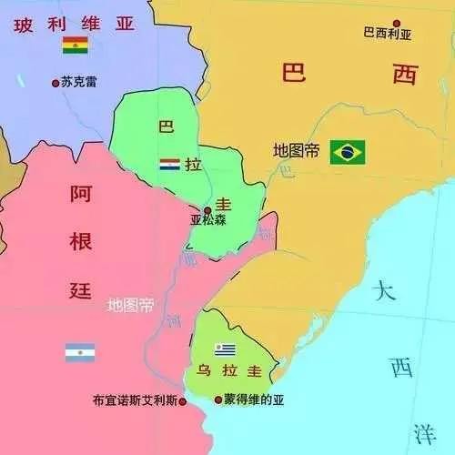 2,乌拉圭东岸共和国(西班牙语:República Oriental del Uruguay;英语:Oriental Republic of Uruguay,Uruguay),简称“乌拉圭”,位于南美洲的东南部,乌拉圭河与拉普拉塔河的东岸,北邻巴西,西接阿根廷,东南濒大西洋。