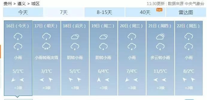 遵义:1~3℃,小雨转雨夹雪