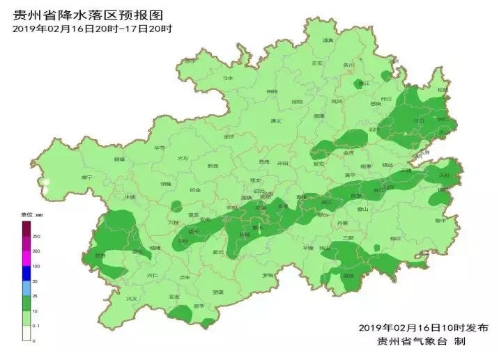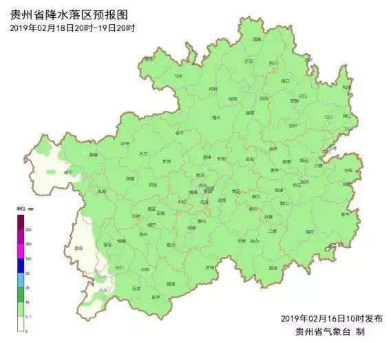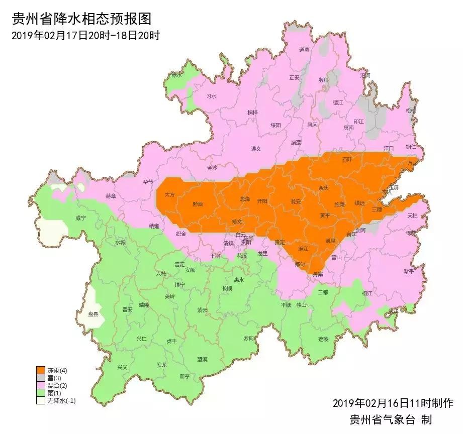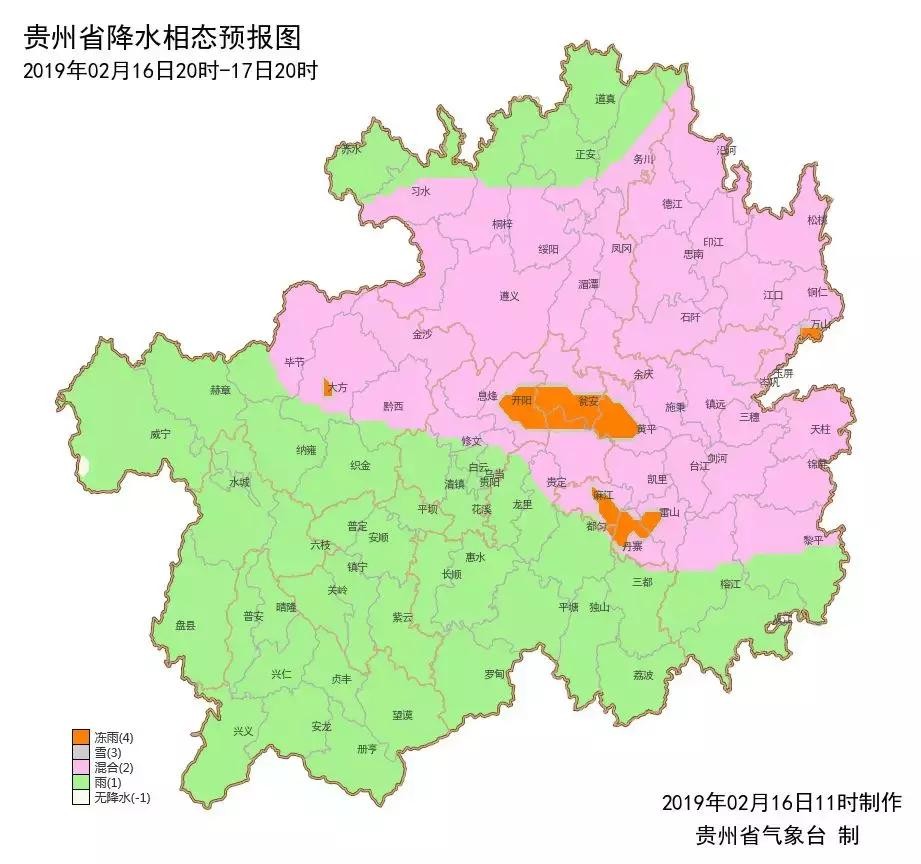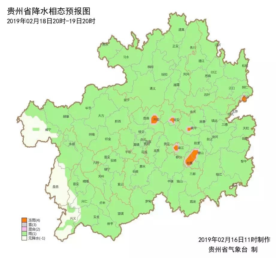 2月16日08时,除省的西南部和南部边缘地区外,省内其余地区气温均在4℃以下,全省有65县城气温低于4℃,其中有8县城气温在0℃及以下(最低为万山-1.3℃),15日08时至16日08时,全省有4县城出现冻雨(开阳、万山、麻江、丹寨)。