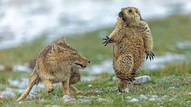 The picture captures a remarkable stand-off between a Tibetan fox and a marmot, and was taken on the Qinghai-Tibet Plateau.