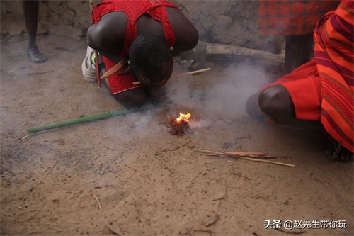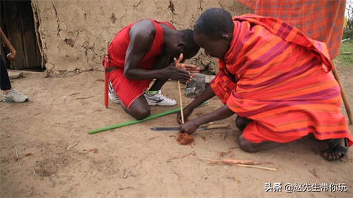 也有马赛人腰间佩戴刀,如同我国藏民可以随身带藏刀一样。下图中两个马赛人就是在给我们演示钻木取火,是在配刀上操作。那把刀还是挺锋利的,我问他可不可以卖给我,这个马赛人非常热情说可以送给我。可惜我无法带回国,没有接受这个礼物。