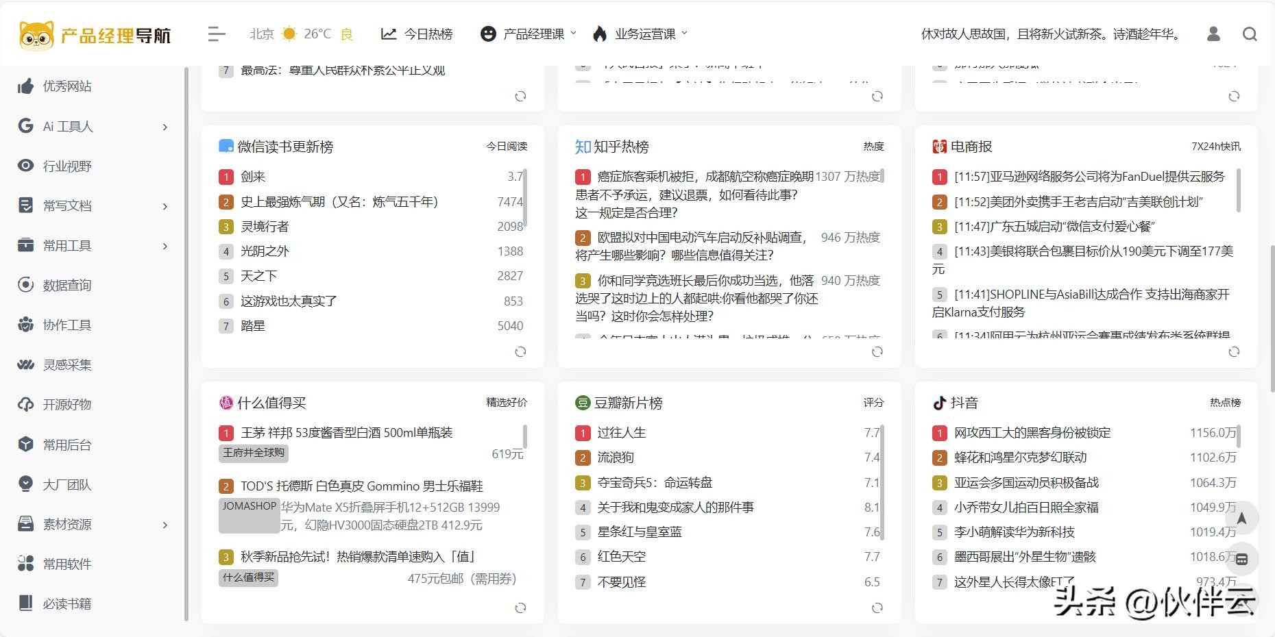 一款定位产品经理、运营、设计师的导航网站。收录了产品、运营、交互设计、用户体验、行业资讯、数据分析、电子商务、产品运营必备工具、国外优秀网站等相关网站。每个网址质量都不错。属于是产品运营设计岗的收藏强推。