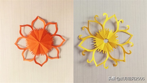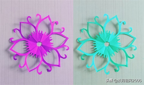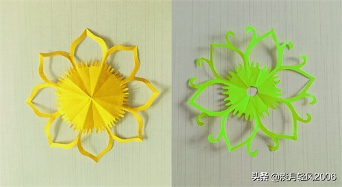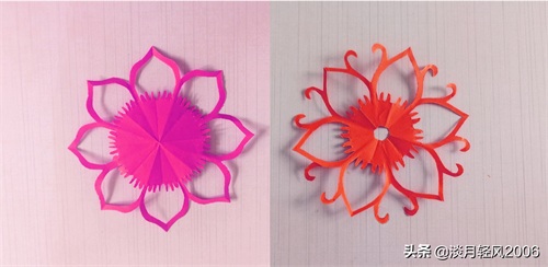 上图中左边画的图案剪出来的是下图左边的样子,是一个简单的八瓣花。