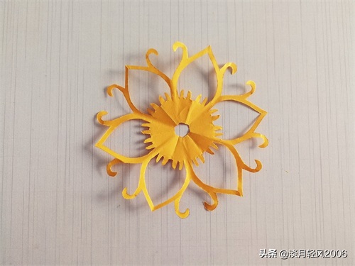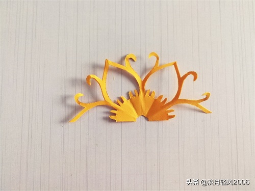 上图中右边画的图案剪出来的是下图右边的样子,是带一点小装饰的六瓣花(底部尖角剪下,中间就是空的,左边图中间没剪就是左下图的样子,是实心的花)
