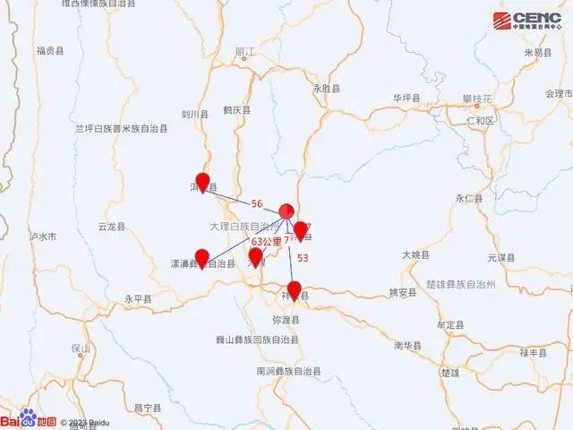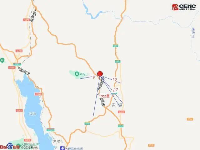 震中距宾川县17公里、距大理市37公里、距祥云县53公里、距洱源县56公里、距漾濞彝族自治县63公里,距大理白族自治州46公里,距昆明市244公里。