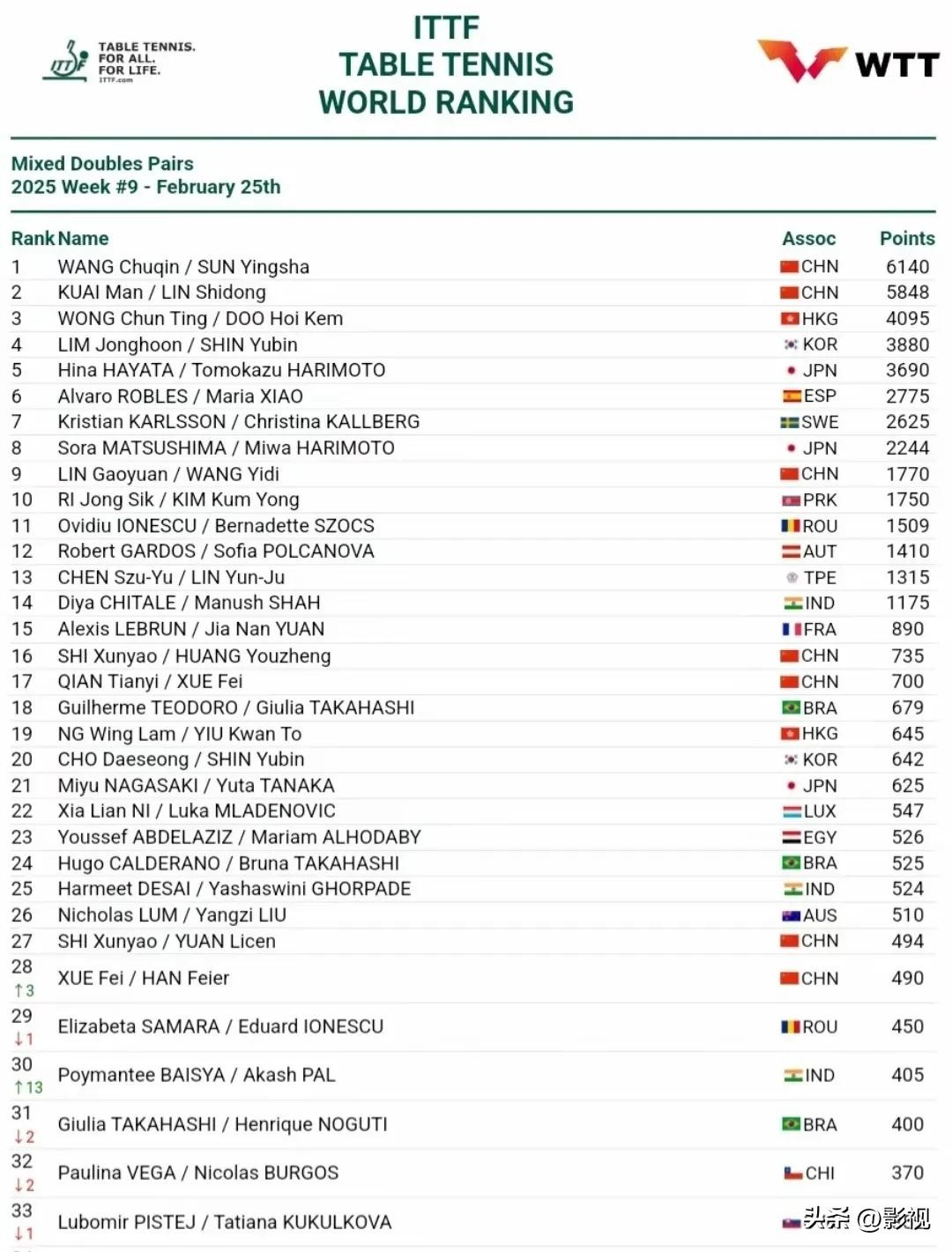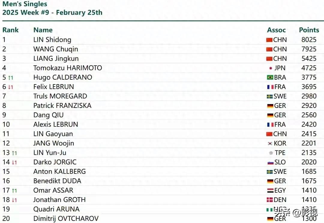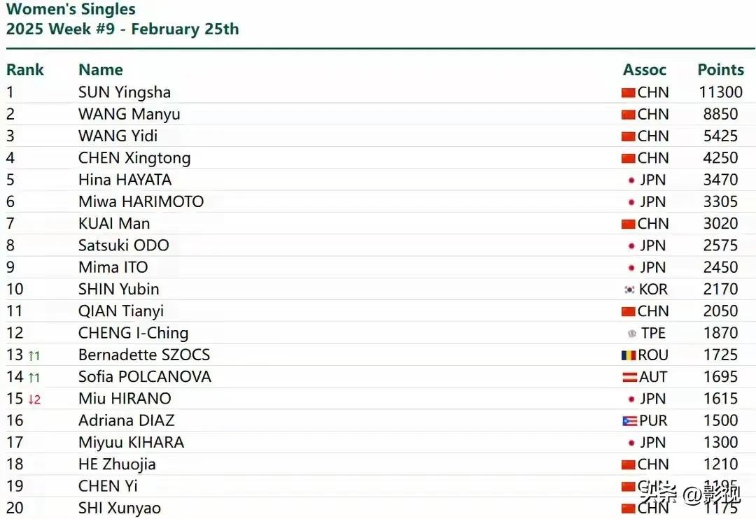 2025年2月25日,国际乒联第9周世界排名重磅出炉!这场积分赛的每一分差距,都是技术与心理的双重博弈!