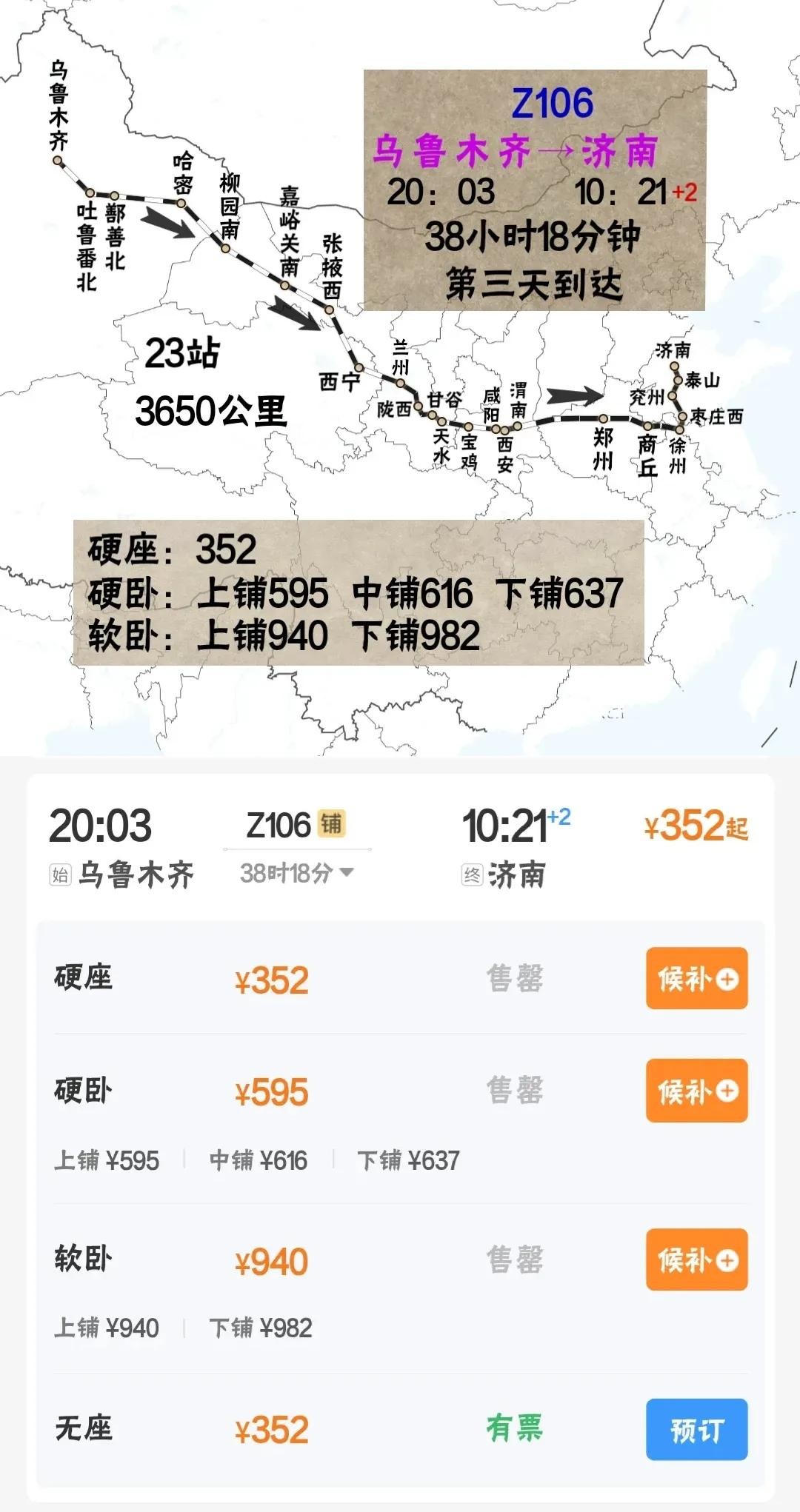 济南站开往乌鲁木齐站Z105次列车,历时37个小时,3650公里