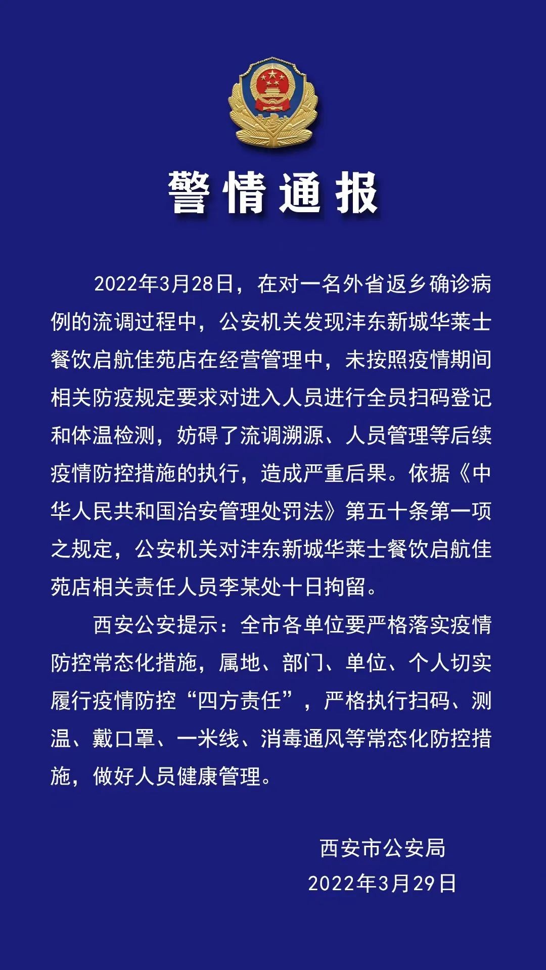 2022年3月28日,在对一名外省返乡确诊病例的流调过程中,公安机关发现沣东新城华莱士餐饮启航佳苑店在经营管理中,未按照疫情期间相关防疫规定要求对进入人员进行全员扫码登记和体温检测,妨碍了流调溯源、人员管理等后续疫情防控措施的执行,造成严重后果。依据《中华人民共和国治安管理处罚法》第五十条第一项之规定,公安机关对沣东新城华莱士餐饮启航佳苑店相关责任人员李某处十日拘留。