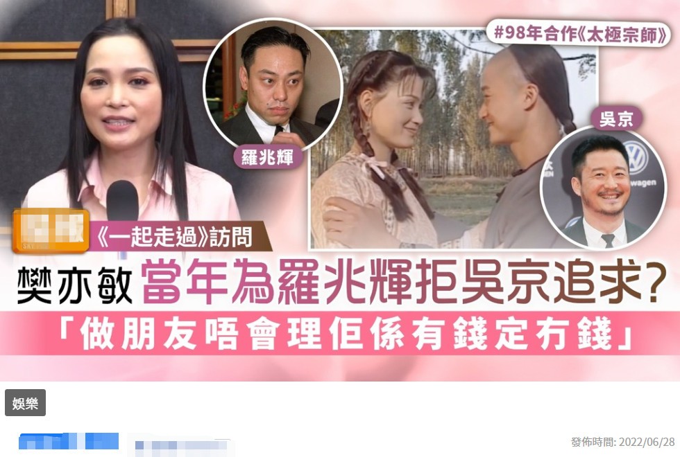 问到当年的事实是怎样的?樊亦敏没有直接说是否有跟吴京或罗兆辉恋爱,只说自己私生活很低调,认识她的人都知道她的为人。