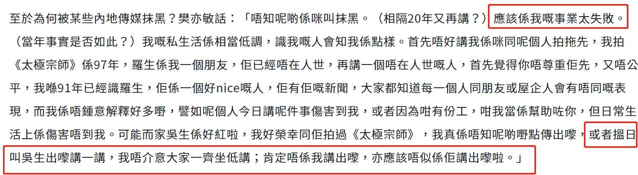 至于吴京,樊亦敏说吴京现在很火,自己很荣幸跟其合作过。那些爆料究竟怎样传开的,她不太清楚,肯定不是她说,应该也不是吴京说的。或许找一天约吴京出来,大家坐下来说清楚。