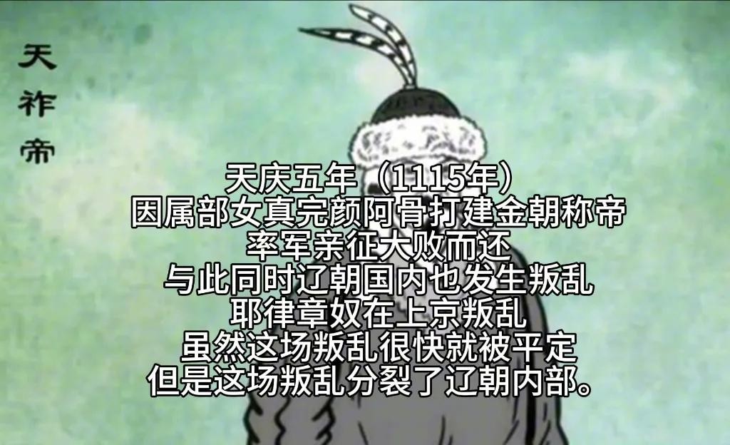 - 主要功绩:前期还算平稳,但后期逐渐昏庸,忠奸莫辨,迷于酒色,社会矛盾极为激化,辽朝的统治开始衰落,其间被辽统治者压迫的女真族开始兴起,最终成为辽的掘墓人。