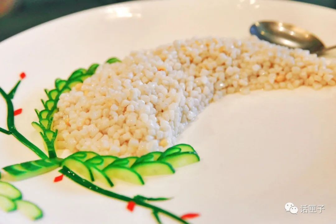 鱼米之乡,来枇杷园的食客几乎必点,“鲈鱼去头,去尾,去骨,鱼肉切成粒。切鱼粒考验刀工,与其说是切不如说是‘锯’,速度要慢,且要用巧劲,才能将鱼粒切成方正且棱角圆润。”研制这道菜,沈振明深谙粗菜细作的门道,鱼粒上浆滑油,配以松仁,摆盘成麦穗状,“吃的时候,挖一勺鱼粒,放一滴醋,吊鲜,口感华润,回甘。”