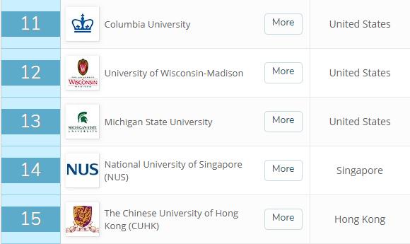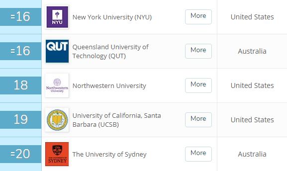 澳大利亚第三,有6所大学上榜,其中澳大利亚排名第1是昆士兰科技大学。此外还有,中国上榜3所,新加坡上榜2所,丹麦上榜2所。