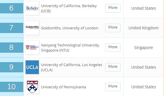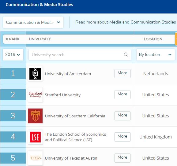 知名排名机构QS最新发布的世界大学传媒排名榜单中,阿姆斯特丹大学此次位列世界大学传媒排名第1,斯坦福大学(第2名),南加州大学(#3),伦敦政治经济学院位列第4,得克萨斯大学-奥斯汀位列第5。