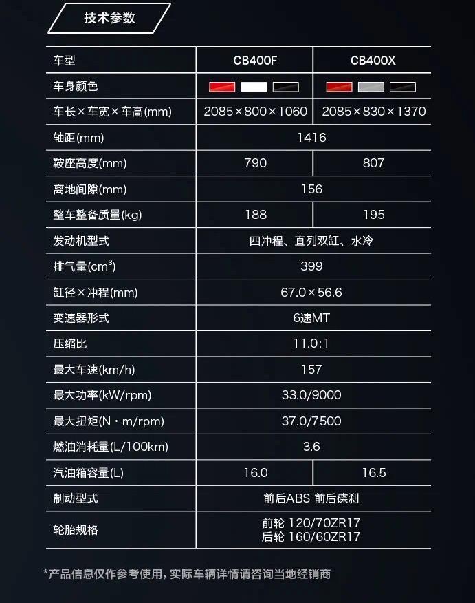 配置方面,制动系统由前后ABS+前后碟刹组成,前叉则是跟川崎400系列一样的正立式。整车坐高则是790mm,机车版的CB400F整备质量比探险版的CB400X轻了7KG(195KG)为188KG。