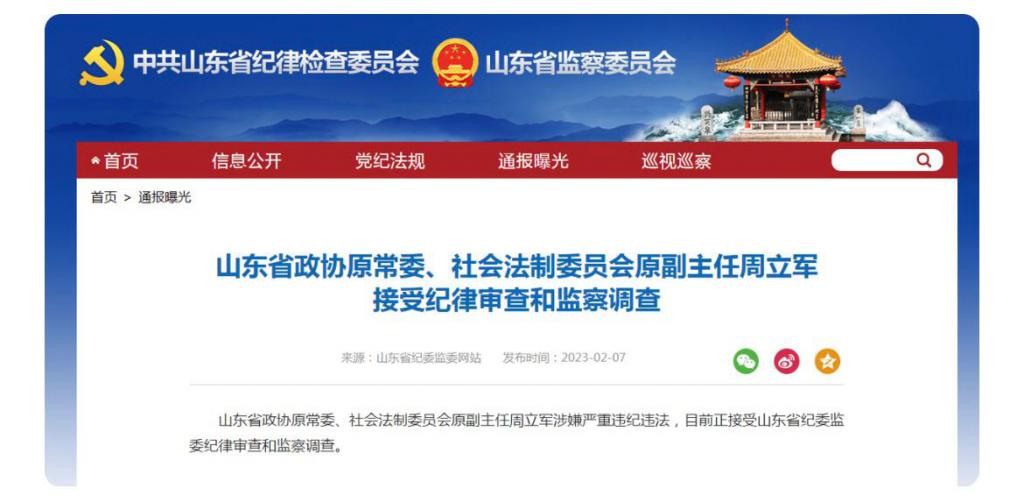 据山东省纪委监委网站 2 月 7 日消息,山东省政协原常委、社会法制委员会原副主任周立军涉嫌严重违纪违法,目前正接受山东省纪委监委纪律审查和监察调查。