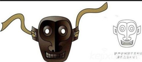 根据1976年在中国陕西省城固县苏村出土商代青铜人面具绘制。这个青铜面具是商代晚期的器物,现收藏在陕西省博物馆。它直径11cm,背部有二个钮。可以方便穿系。