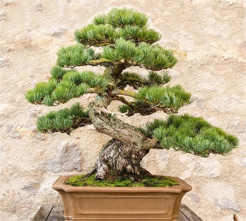 日本五针松别名五钗松、日本五须松,松科松属常绿乔木,树冠圆锥形,树皮灰黑色,不规则鳞片状剥裂,小枝密生淡黄色柔毛,针叶5针一束,微弯曲,蓝绿色,较短细。原产于日本暖温带地区,常被用作盆栽或庭院观赏。