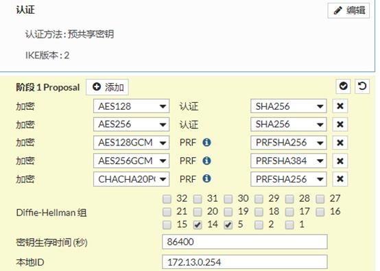1. 配置阶段1所有IKE版本,共享密码,支持的算法,支持的DH组,秘钥生存时间,本地ID等