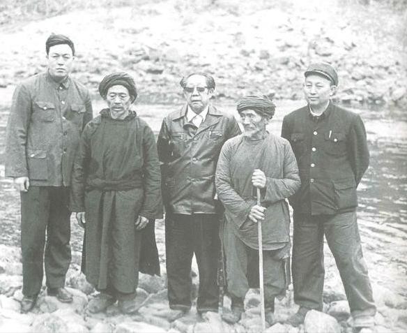 1985年3月,周仁杰(中)重返长征路时,与乡亲们合影。