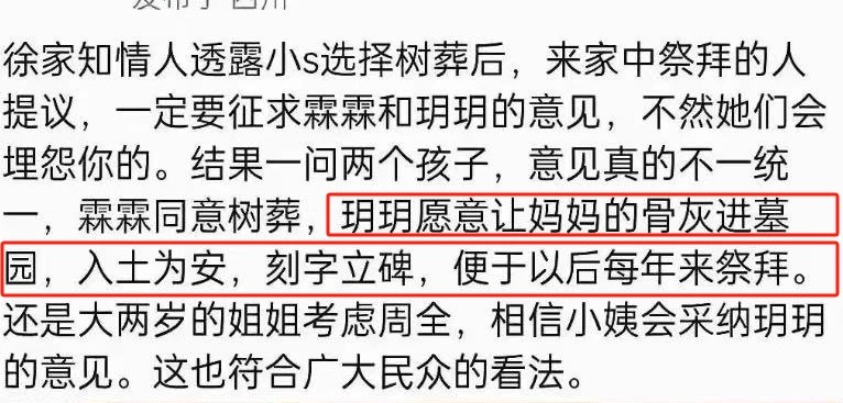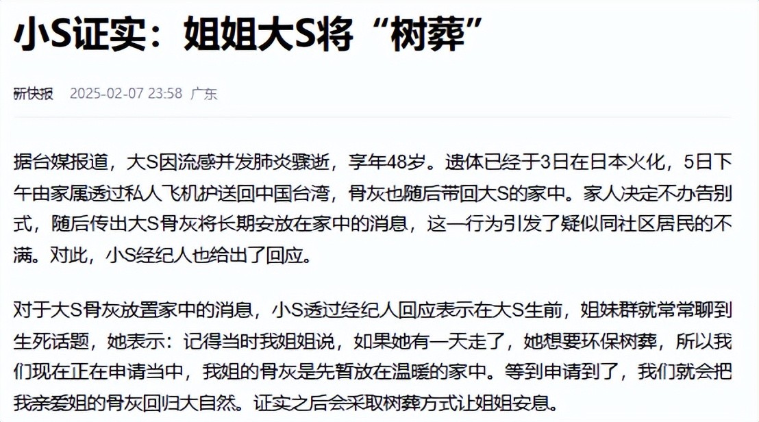 信息来源:新快报 2025-02-07 小S证实:姐姐大S将“树葬”
