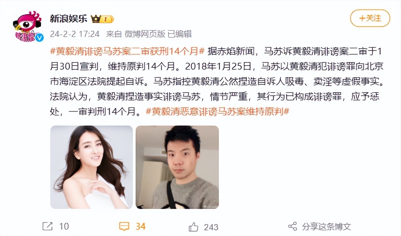 经过漫长的法律程序,造谣的黄毅清终于受到了应有的惩罚。
