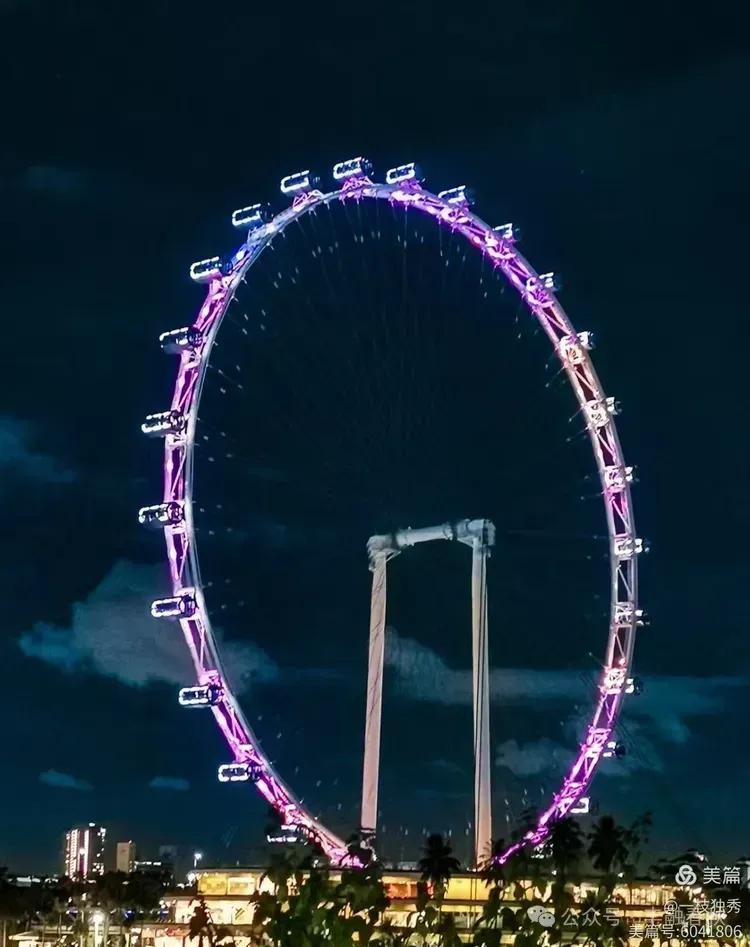 2、新加坡摩天观景轮又名飞行者摩天轮,是一个巨型摩天轮,共有28个观光客舱,高165米相当于42层楼高,比英国伦敦的“千禧眼”还要高30米。坐在这个摩天轮里,可把新加坡风光明媚的滨海湾、高耸的摩天大楼37分钟之内尽收眼底,甚至天气晴好时,马来西亚及印度尼西亚部分岛屿的大好风光亦可收入眼帘。