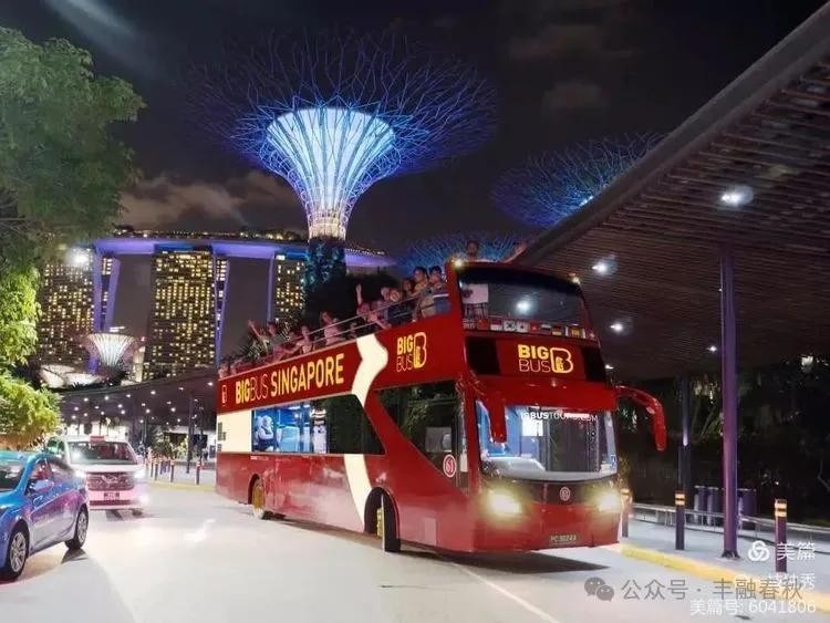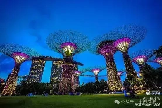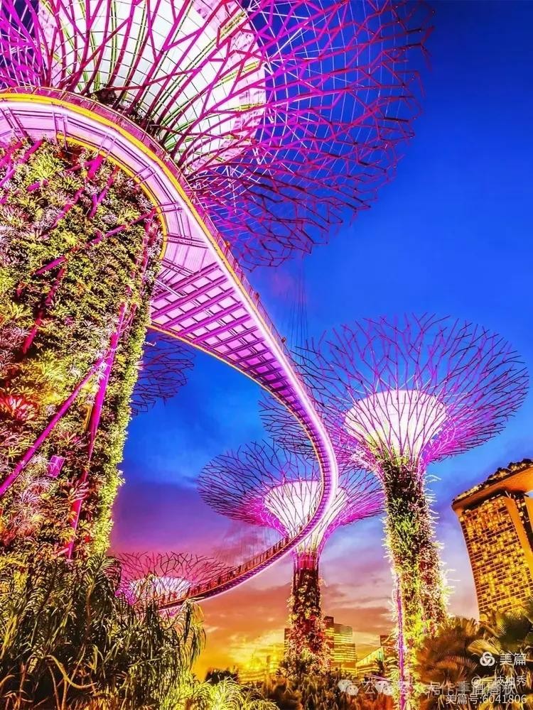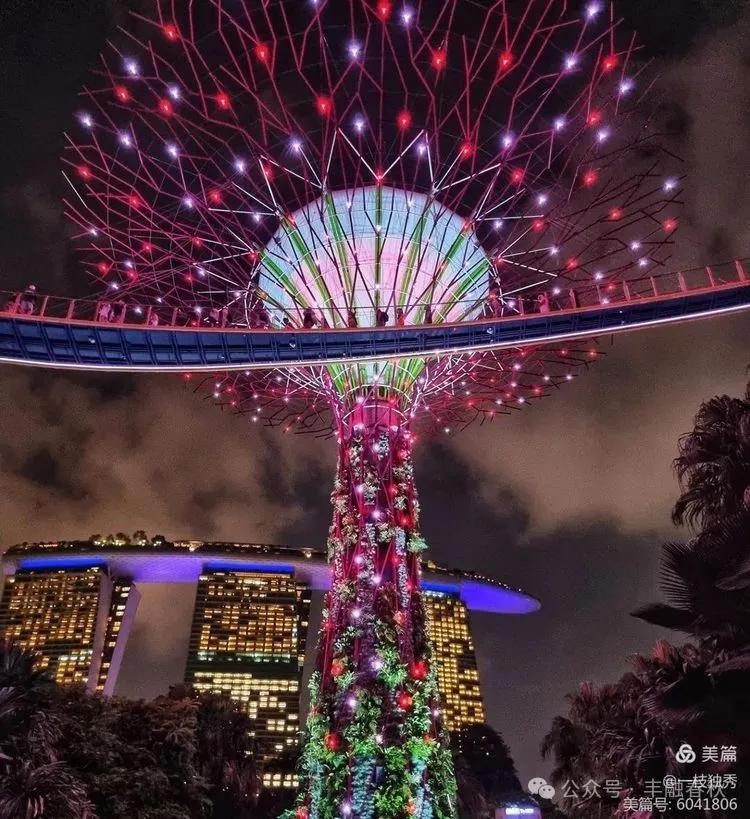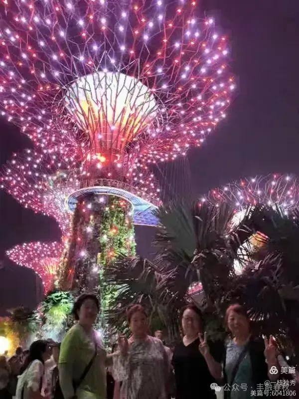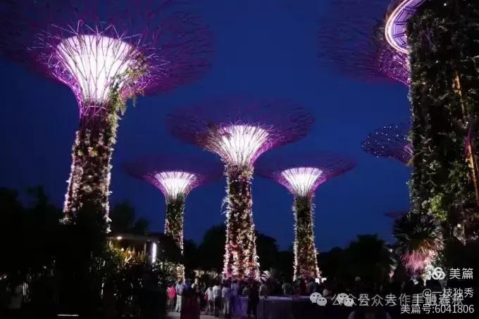 6、夜幕下的灯光秀很美,很快我们就来到了滨海湾花园,抬头看见那些超级树时,非常震撼,感觉置身在超现实的世界里,奇妙又奇幻!超级树灯光秀是新加坡滨海湾花园的一大亮点。夜晚时分,树木被彩色灯光照亮,在夜空中形成一道美丽的风景线。我们在这里拍照留念,留下了美好的回忆。