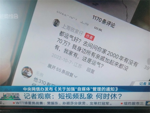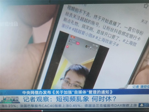 2023年7月11日,上海新闻早七点新闻在“记者观察:短视频乱象 何时休”这个栏目里重点曝光了上海败家仔虚构人设,编造剧情,骗取同情,非法牟利的现象,其中明确指出了败家仔在300多条短视频中虚构了自己的悲惨经历,明明住着小别墅,有上千万的股票资产,父母也有收入不菲的退休工资,完全过上了小康生活,但是却骗了一位李女士的长辈不停的打赏,李女士只能打电话到电视台控诉长辈被洗脑,完全不听劝阻的事情!