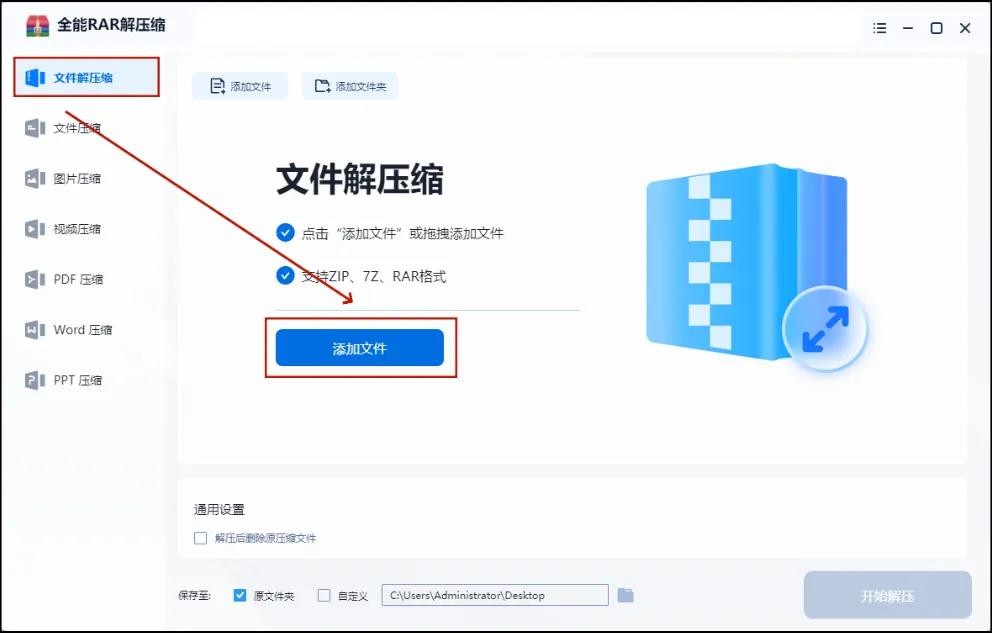 首先我们打开软件首页,选择“解压文件”功能,点击“添加文件”按钮从电脑中上传需要解压缩的文件;