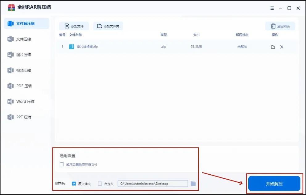 软件支持ZIP、RAR等格式的压缩包进行解压,可以一次性上传多个文件进行批量操作;