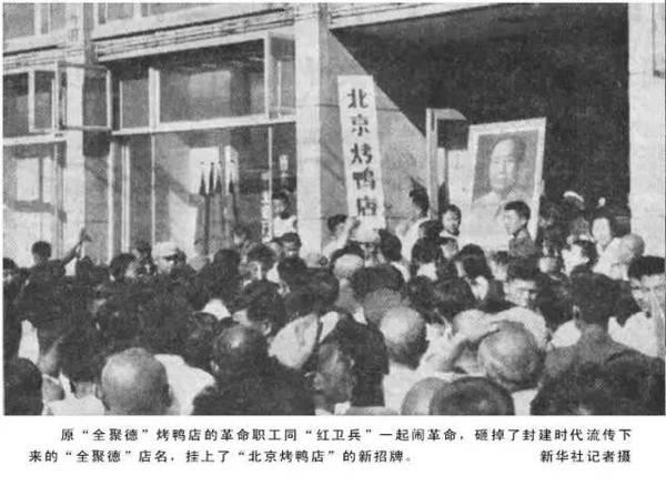 8月19日晚,北京二中、十五中、二十五中、六十三中的红卫兵聚集在北京前门大街的全聚德烤鸭店,声称全聚德烤鸭店是封资修的招牌,必须砸掉。结果全聚德的招牌被拆下,红卫兵换上了新招牌“北京烤鸭店”。