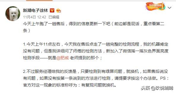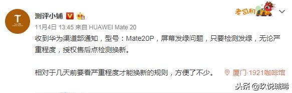 @测评小铺表示已经收到华为渠道部的通知,只要出现绿屏问题的用户,只要检测到确实存在显示屏发绿的情况,无论严重程度,都可以到授权售后服务点进行检测后换机。此外,在贴吧也有数位用户表示,自己已经通过售后网点换到了新机,如果再次出现显示屏发绿的问题,仍旧可以继续换机。@新潮电子徐林也亲身多次与华为售后沟通,得到的反馈是有复现问题就换机。