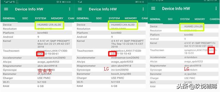 在检测结果中Touchscreen中,代码BOE为京东方供应的OLED屏,代码LG的为LG供应屏。如果检测的自己手机为LG屏幕,也不要慌张,并不是所有的都会出现绿屏问题,但对于Device为LYA-L09的手机用户,故障的发生率相对要高一些。只需要按下述方法进行简单排查即可。
