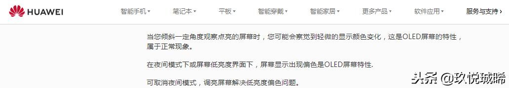 同时,华为官网也有关于OLED屏发黄发绿,颜色不均匀,上下色彩有差异,夜间模式或低亮度界面显示偏色的解释说明: