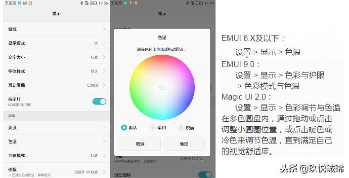 对于存在绿屏问题的用户可以按照以下方法进行操作:在多色圆盘内,通过拖动,调整暖色或者冷色来调整色温,改善显示效果;调高屏幕亮度再一次进行确认;资料备份之后进行一次最新版本的升级。如果还是存在以上故障的话,到华为售后网点进行检测更换。