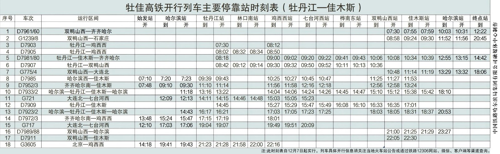4日,龙头新闻·生活报记者从铁路部门获悉,12月6日,牡佳高铁将正式开通运营,列车时刻表新鲜出炉。