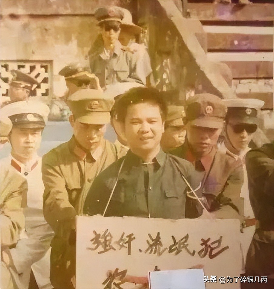 一名年轻男子因为犯强奸罪被抓,胸前挂着一块牌子,上面写了他的名字和罪行,名字上面被画了一个红叉,相信上了年纪的朋友都知道这意味这什么吧。