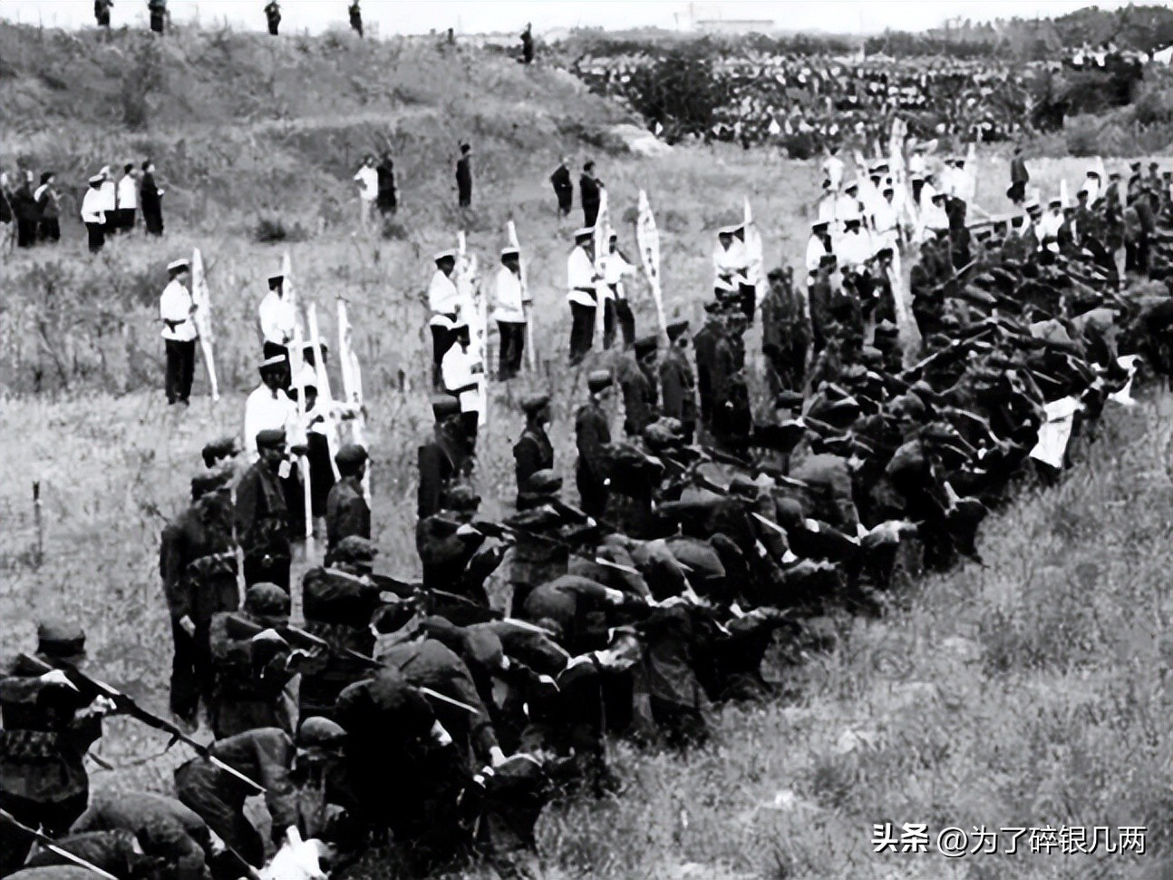 在刑场进行集体处决的场面,可以看到地上整整齐齐的跪着十几个犯人,在最后面还有一些群众在围观,之前有一个网友问过我,为什么以前执行死刑的时候,要有武警按住他们,这主要是为了防止他们因为害怕乱动。