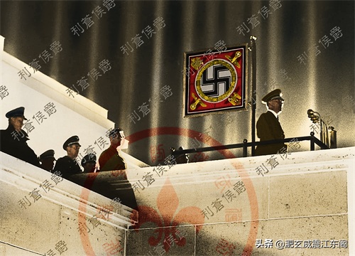 图4:同样是希特勒在主席台上演讲,身后还清晰可见副元首赫斯,空军司令戈林等人。希特勒旁边的元首旗帜十分的醒目。