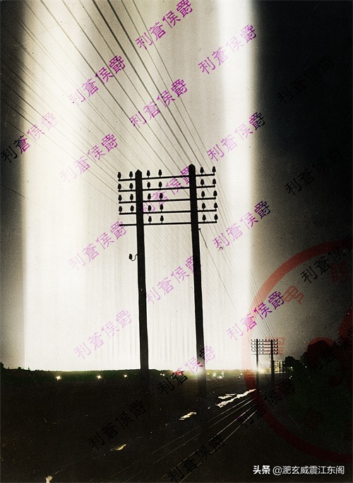 图6:在纽伦堡附近的铁路线地带观看集会场灯光秀的场景,其光柱因为远距离而聚集成了一束极其巨大的超级光柱,其效果对观看之人的震撼比起近景更是有过之而无不及,恐怕同时代能与这一场景相提并论并超越之的,也只有1945年美国人的核爆蘑菇云了。