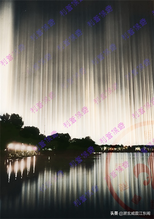 图5:在纽伦堡教区的河边看远方集会场的“圣殿”的效果,道道光柱直冲云霄,其令人震撼的观感无以复加,恐怕当时没有任何一个国家能将探照灯运用到如此地步。