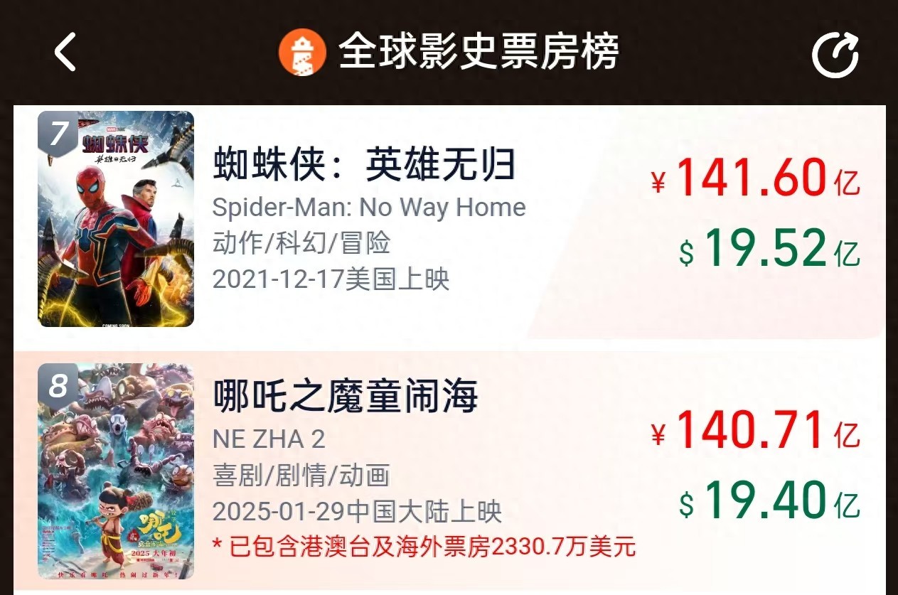 《哪吒之魔童闹海》本周产出票房已超3亿,继续刷新纪录,即将赶超《蜘蛛侠:英雄无归》(141.6亿元人民币/19.52亿美元)晋级全球影史票房榜第七。