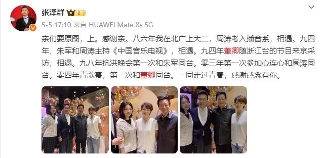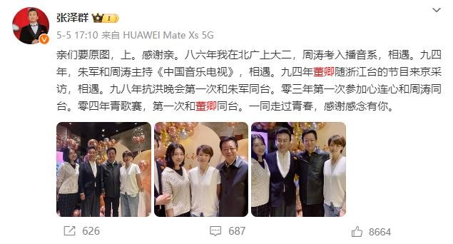 而董卿除了时不时被网友偶遇带着儿子出游,就只会出现在别人的社交平台动态,比如今年5月5日,主持人张泽群的微博。