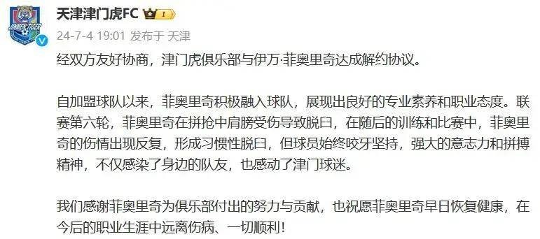 菲奥里奇的离队主要是因为伤病问题。在本赛季第6轮比赛中,他遭遇了肩膀脱臼的伤病。虽然经过治疗,但伤情一直反复,最终导致习惯性脱臼。为了彻底康复,菲奥里奇需要进行手术治疗。考虑到康复周期较长,天津津门虎最终决定与他解约。