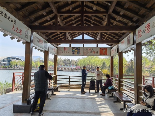 中心湖西南角有木结构水榭,可供游人休息,经常有人在此吹拉弹唱。