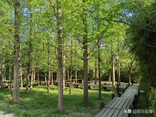 中心湖南岸是一片水杉林,一颗颗水杉树整齐地排列着,笔直的树干挺拔肃立,直插云霄,蔚为壮观。